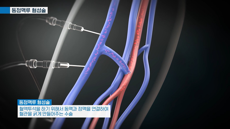 투석혈관로는 동맥과 정맥을 이어 만드는 동정맥루 수술을 통해 만들어야 하는데, 환자의 상태에 따라 자가혈관이 또는 인조혈관을 이용해 수술한다. 투석혈관로를 만들기 위한 수술에 대해 정확히 알고 혈액투석에 대한 이해의 폭을 넓혀보자.