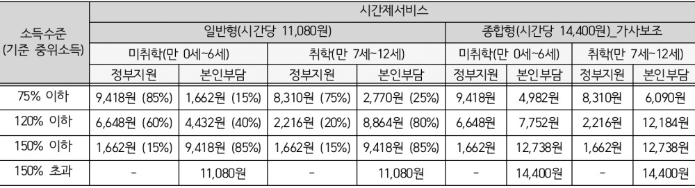 서비스 이용요금은 시간당 11,080원이며, 정부 지원 대상자로 결정될 경우 소득 수준에 따라 시간당 최소 1,662원에서 최대 9,418원까지 부담하면 된다.