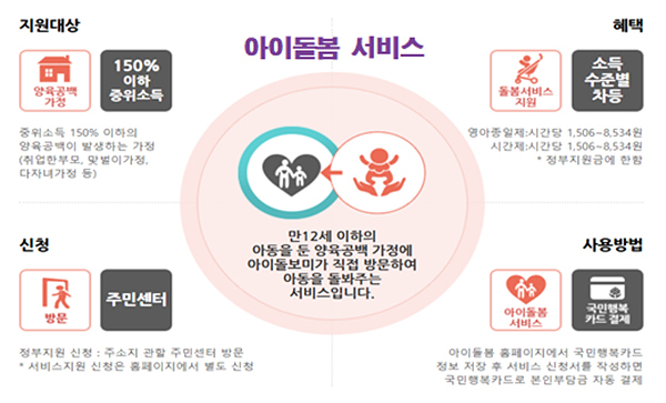 아이돌봄 서비스는 부모의 맞벌이 등으로 양육 공백이 발생한 가정의 만 12세 이하 아동을 대상으로 아이돌보미가 집으로 찾아가 돌봄 서비스를 제공하는 사업이다.