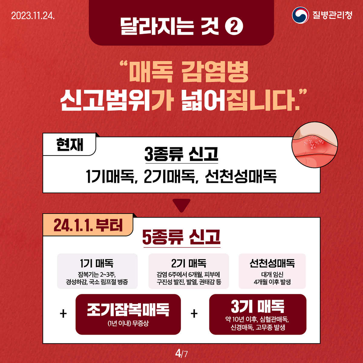 또한, 기존에는 3종류의 매독(1기, 2기, 선천성 매독)만 신고하던 것에서 5종류의 매독(조기잠복, 3기 매독 추가)을 신고하도록 신고 범위가 확대됐으며, 관할 보건소에서는 신고된 모든 매독 환자를 역학조사 대상에 새롭게 포함해 추가 전파를 차단할 방침이다.