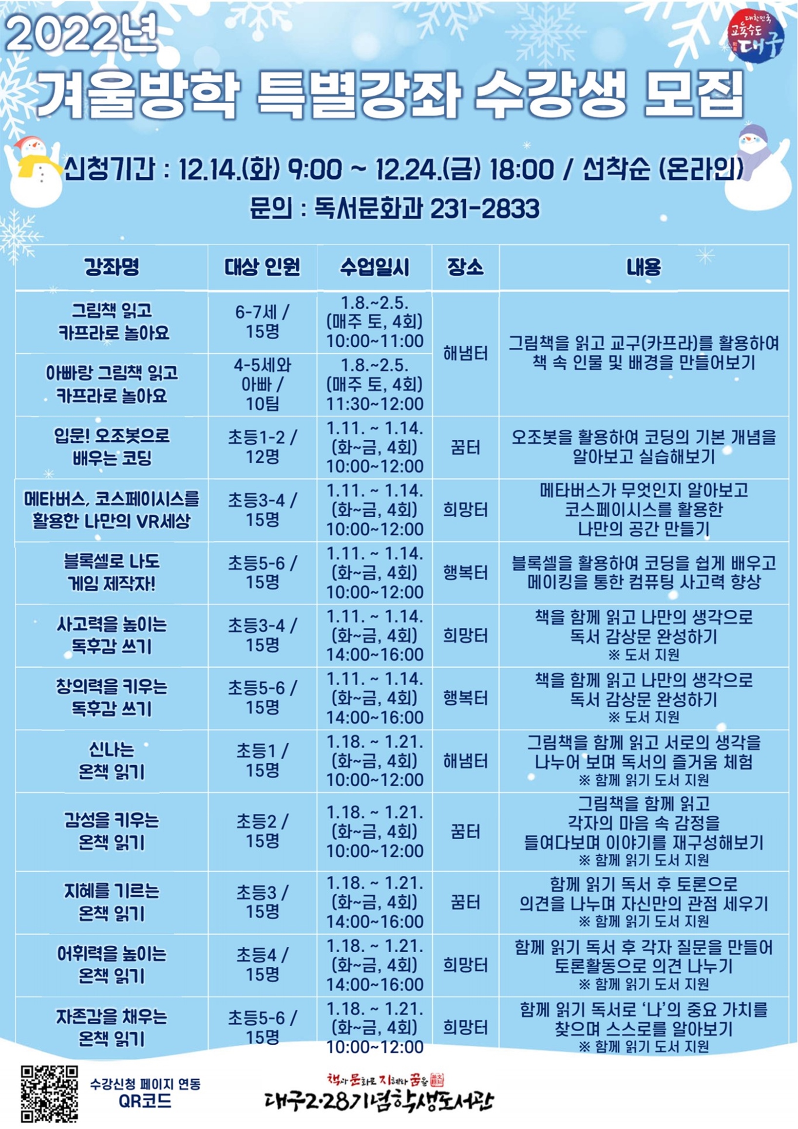 대구2‧28기념학생도서관은 겨울 방학을 맞이하는 유아와 학생을 대상으로 12개의 특별강좌를 개설하고 12월 14일(화)부터 도서관 홈페이지(http://library.daegu.go.kr/228)를 통해 참가자를 모집한다.