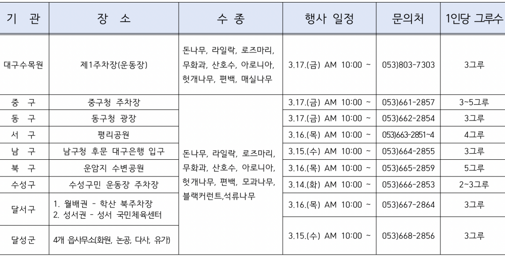 기관별 행사 일정은 대구수목원의 경우 3.17.(금) 오전 10시부터 선착순으로 수목원 제1주차장(운동장)에서 라일락, 로즈마리, 무화과 등 9종의 묘목 2,050 그루를 1인당 3그루씩 나눠주며, 각 구·군에서는 3월 중 지정된 장소에서 석류, 라일락, 아로니아, 무화과 등 11종 33,720그루(구·군 당 4,215그루)의 묘목을 1인당 2~3그루씩 나눠줄 예정이다.