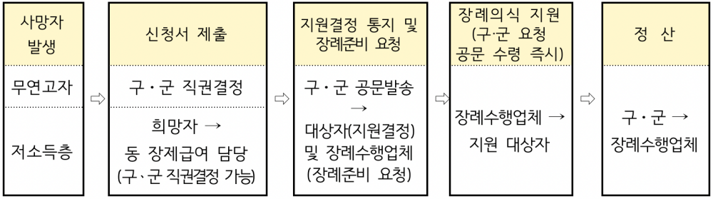 지원 절차는 무연고 사망자의 경우 구·군에서 직권으로 지원 결정을 하며, 저소득층 사망자는 연고자가 동 행정복지센터에 신청서를 제출하고 구·군에서 지원 결정하면 관내 협약된 장례식장 또는 장례업체에서 신청자와 일정 등을 조율해 장례 서비스가 제공된다.
