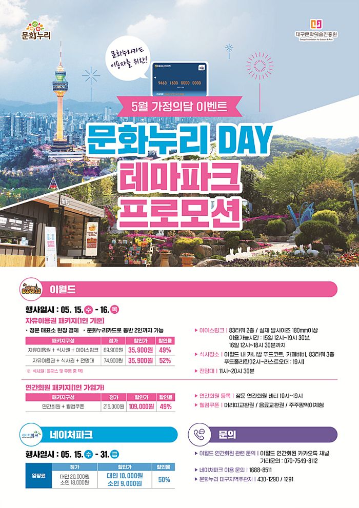 (재)대구문화예술진흥원(이하 ‘문예진흥원’)은 문화누리카드 사용자들에게 다양한 혜택을 제공하고자 가정의 달 이벤트 ‘문화누리DAY’를 오는 5월 31일까지 진행한다.