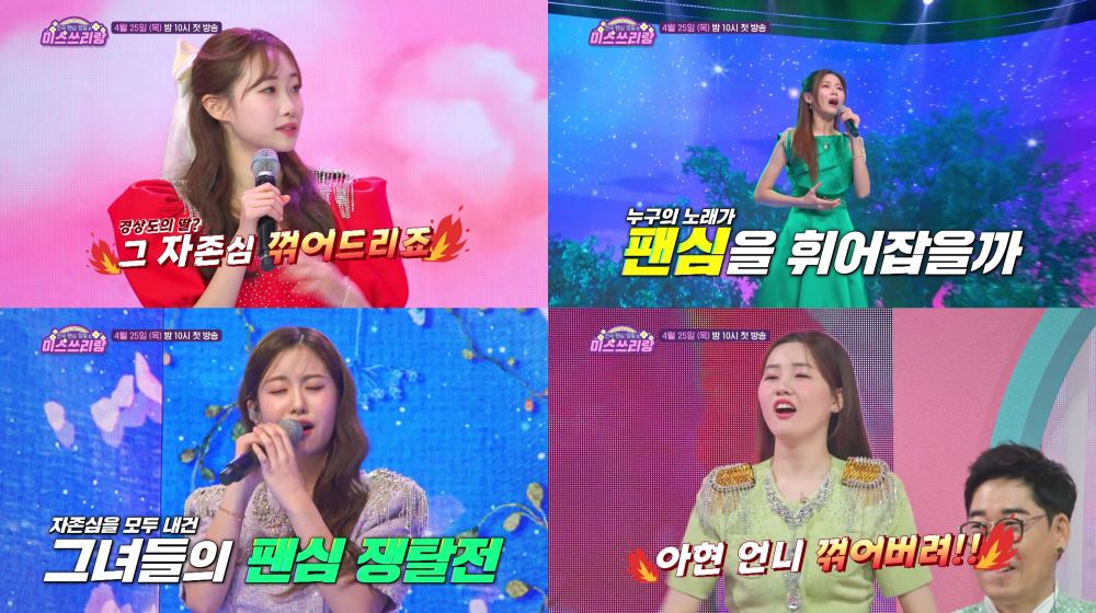 무엇보다 지역별 점수를 걸고 노래 대결을 펼치는 만큼 멤버들의 사명감은 더욱 불타오를 것으로 보인다. 정서주는 “고향 부산 쪽 팬심은 꽉 잡고 있다”라며 자신감을 드러냈고, 이에 배아현은 “그 자존심을 꺾어 드리겠다”고 답하며 아슬아슬한 신경전을 벌였다. 각 지역의 팬심을 쟁탈하려는 두 사람의 신경전이 보는 이들의 손에 땀을 쥐게 했고 ‘미스쓰리랑’ 첫 방송에 대한 기대감을 증폭시켰다.