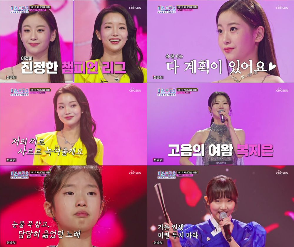 판소리계를 접수한 장원들이 외나무 다리에서 만났다. 2023년 전주대사습놀이 장원 노규리와 같은 대회 2018년 장원 진혜언이 겨뤘다. ‘미스트롯3’에 집중하기 위해 고등학교 자퇴까지 하는 결단을 내린 진혜언. 그는 이찬원의 ‘시절 인연’으로 몰입도 높은 무대를 빚어내 올하트를 받으며 노규리를 제쳤다.
