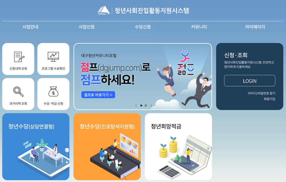 참여를 희망하는 청년은 ‘청년사회진입활동지원시스템’ (https://youthdream.daegu.go.kr)을 통해 온라인으로 신청할 수 있으며, 동 시스템 게시판과 대구시 홈페이지를 통해 보다 상세한 안내 공고를 확인할 수 있다.
