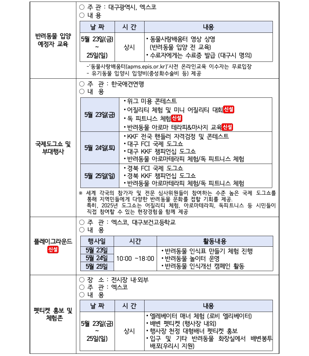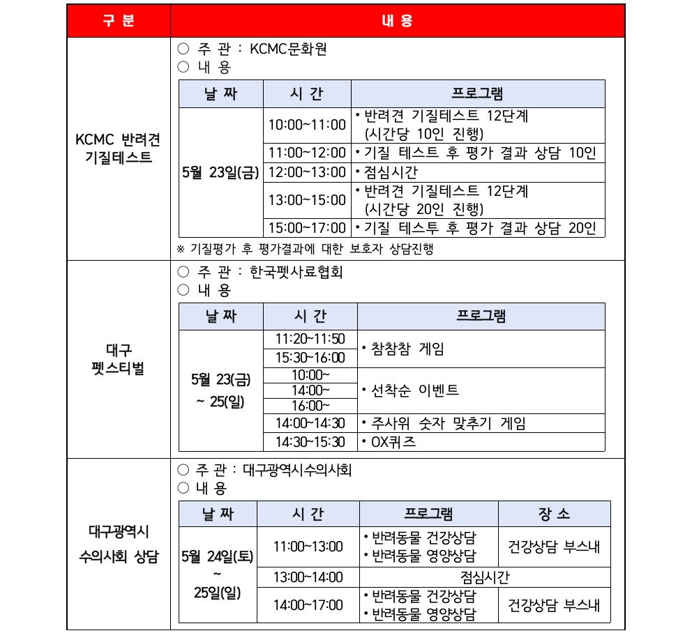 한편, 대구시는 성숙한 반려동물 문화 조성을 위해 행사장 안팎을 펫티켓 체험존으로 배치해 공공장소에서의 배변, 이동 요령 등 펫티켓과 관련된 전반적인 부분을 안내, 체험, 교육하는 공간으로 조성했다.