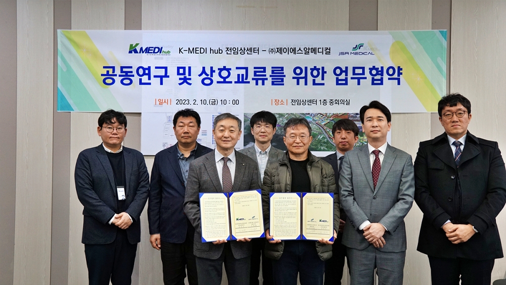 케이메디허브 전임상센터는 (주)JSR메디칼과 정보 교류 등 상호 협력을 위한 업무협약을 체결했다. (주)JSR메디칼(대표 김재황)은 현재 대장암 수술 시 배 바깥쪽으로 꺼내 만들어야 했던 인공항문을 대체하는 인공장관관리기를 세계 최초로 개발 중이다.