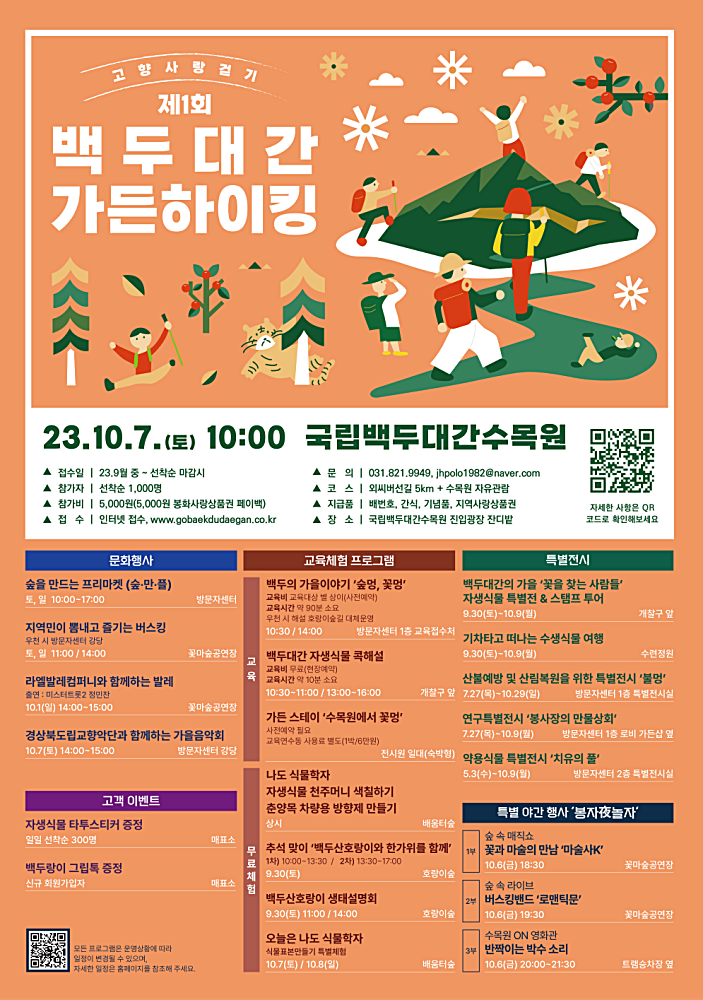 ‘2023년 백두대간 가을 봉자 페스티벌’에 대한 자세한 사항은 국립백두대간수목원 홈페이지(www.bdna.or.kr)를 참조하고, 전화 054-679-1000으로 문의하면 된다.
