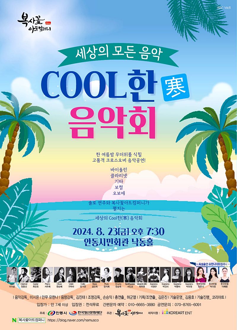 크로스오버 공연그룹 「복사꽃아트컴퍼니」(음악감독 이시온)는 지난달 경북도청 동락관 대공연장 공연에 이어 오는 8월 23일 안동시민회관 낙동홀에서 안동 시민들에게 다양한 장르의 공연예술 및 문화 향유를 제공해 드리고자 ‘세상의 모든 음악 – 쿨한(寒) 음악회’를 개최한다.