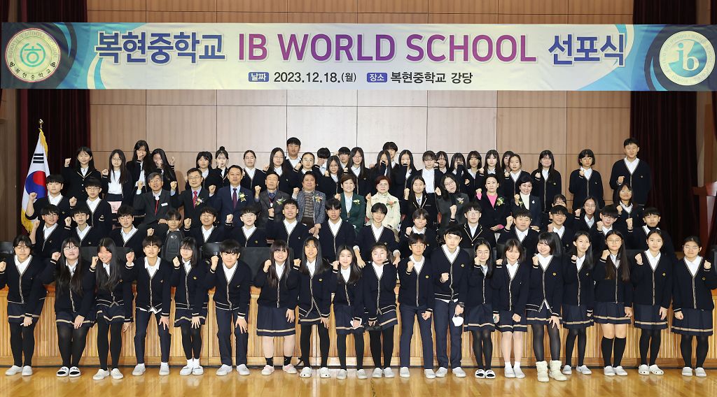 복현중학교는 대구 북구 중학교 최초로 IB MYP(국제 바칼로레아중학교 프로그램) 과정 IB월드스쿨로 공식 인증을 받아 2023년 12월 18일(월) 10시 학교활동 참관 행사 및 월드 스쿨 인증 선포식을 개최한다고 밝혔다.