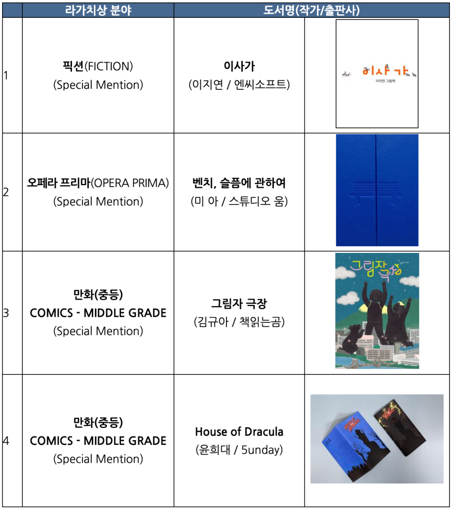 ‘볼로냐 아동도서전’은 볼로냐 라가치상*으로도 유명하다. 올해 우리나라는 ▲ 픽션 부문에서 이지연 작가의 <이사가>(엔씨소프트), ▲ 오페라 프리마 부문에서 미아 작가의 <벤치, 슬픔에 관하여>(스튜디오 움), ▲ 만화(중등, 만 9~12세) 부문에서 김규아 작가의 <그림자 극장>(책읽는곰)과 5unday(글)․윤희대(그림) 작가의 <House of Dracula>(5unday) 등 총 4편이 우수상을 받는다. 이는 지난해 이수지 작가와 최덕규 작가의 작품이 픽션과 논픽션 부문 우수상(스페셜 멘션)을 수상한 데 이은 쾌거이다.