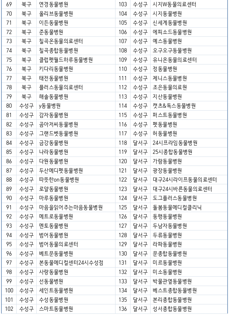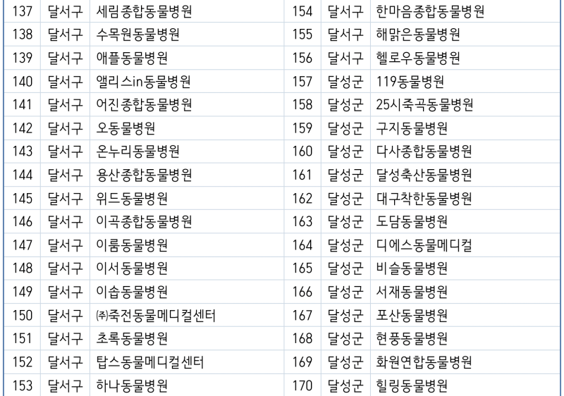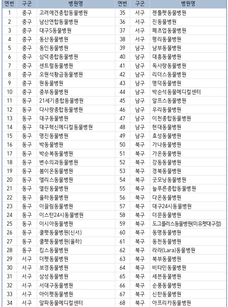 개 광견병 예방접종 동물병원 현황은 구·군청 홈페이지 공지글 또는 구‧군 경제(농업)과에 전화 문의로 확인할 수 있고, 견주는 반려견과 동행하여 가까운 지정 동물병원을 직접 방문, 시술비 3천 원 지불 후 접종 받을 수 있다.