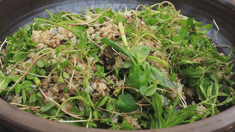 재료는 한정적일지언정 만드는 데에는 한계가 없다는 지견스님. 냉이를 표고버섯, 당근, 한천을 넣고 굳혀 초고추장에 찍어 먹는 ‘냉이 묵’을 만들고 쑥은 쌀과 들깨를 이용해 ‘쑥죽’을 끓인다.