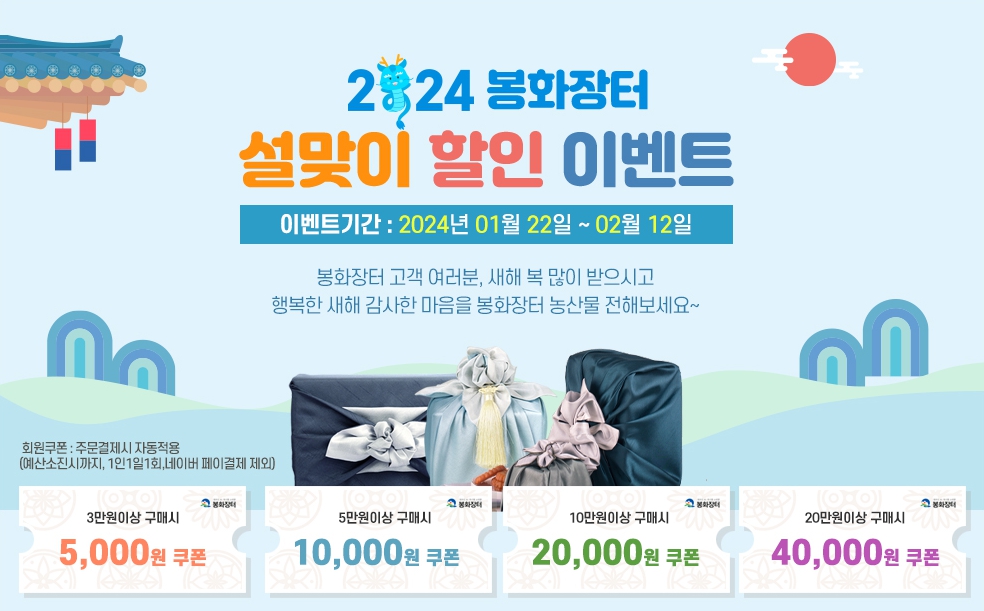 경북 봉화군 공식 농특산물 온라인쇼핑몰‘봉화장터’가 온라인 설맞이 할인이벤트를 진행한다. 오는 2월 12일까지 진행되는 이벤트는 사과, 한우, 참기름, 쌀 등 봉화장터 전 상품을 대상으로 하며 구매 금액별 할인쿠폰을 제공한다.