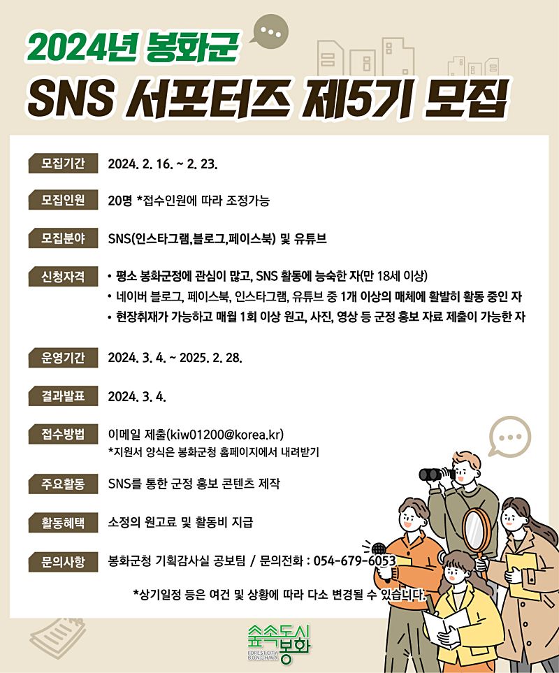 박현국 봉화군수는 “지자체의 SNS 홍보가 날이 갈수록 중요해지고 있는 만큼 봉화군 SNS 서포터즈 모집에 많은 관심을 가져주시고, 창의적인 콘텐츠 제작을 통해 지역 사회 홍보로 이어지기를 소망한다.”라고 밝혔다.