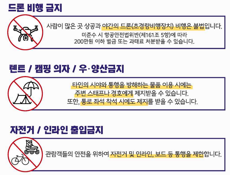 | - 차량통행이 제한되니 관람장으로는 도보로 이동해주세요 - 진행요원의 안내에 귀기울여 주세요 - 우천 시 우산은 다른 관람객의 시야를 가릴 수 있으니 우의를 준비해주세요 - 행사 종료 후에는 안내에 따라 천천히 이동해주시고, 지하철역이 붐비면 인접 지하철역을 이용해주세요 - 쓰레기 봉투를 준비해 본인의 쓰레기는 가지고 귀가해 주세요 |