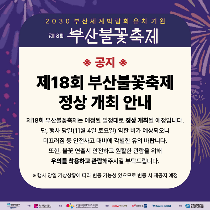 김경덕 부산시 시민안전실장은 “여러가지 기상 상황을 고려한 빈틈없는 안전대책을 마련해 안심하고 즐길 수 있는 부산불꽃축제를 만들겠다”라며, “관람객 여러분들께서도 긴급재난문자 등 안내사항에 관심을 가져주시고, 우산 대신 우의를 준비하고 미끄러짐 등 안전사고에 각별히 유의하시길 부탁드린다”라고 전했다.