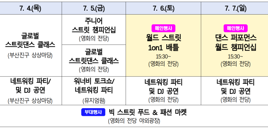 부대행사로는 신청자들을 대상으로 올해 새롭게 추가된 ▲‘주니어(예비 청년) 스트릿 챔피언십’ ▲‘글로벌 스트릿 댄스 클래스’ ▲워너비 토크쇼 등을 함께 진행한다.
