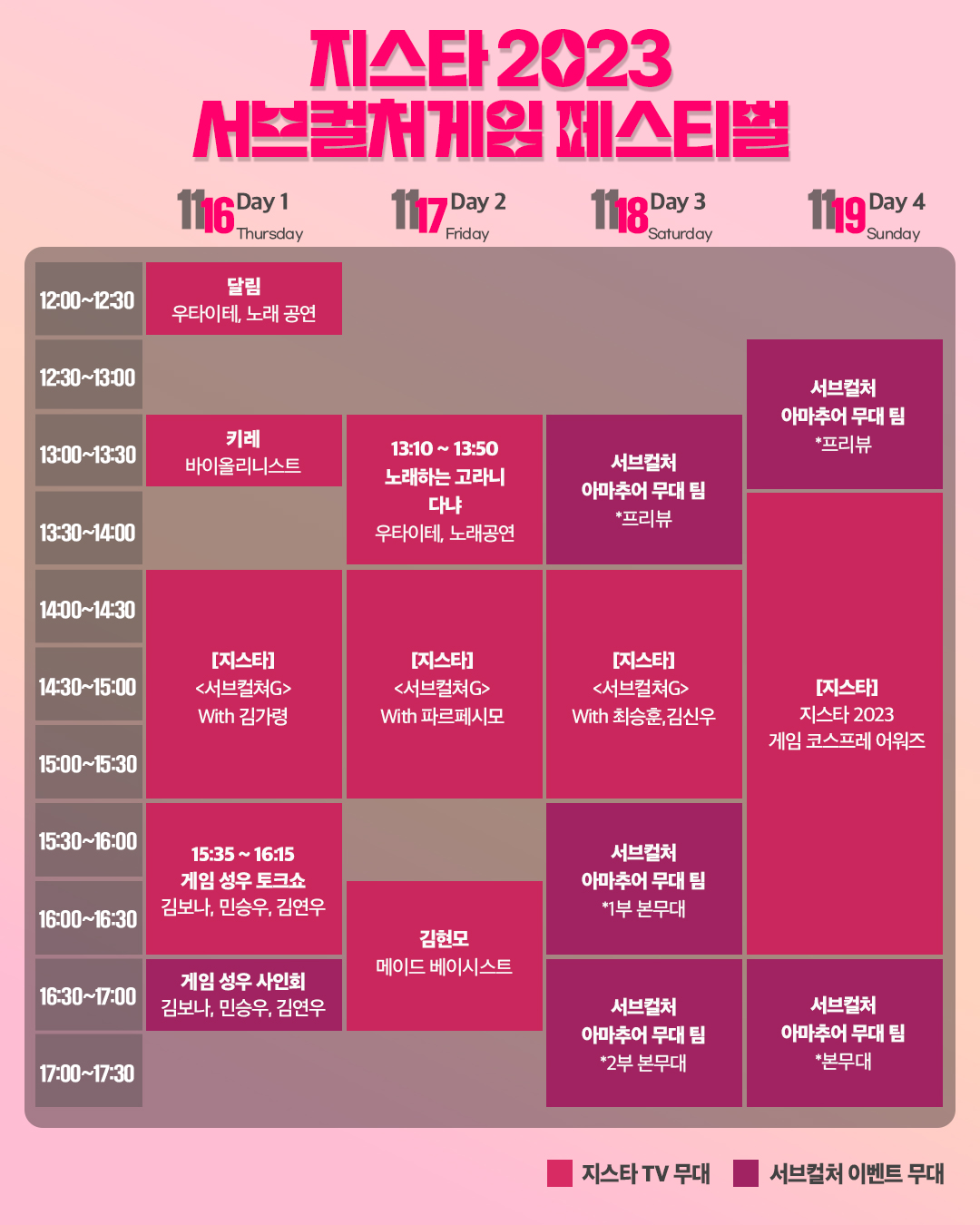지스타 위메이드 페스티브 나잇, 서브컬처 페스티벌 등 일반 참관객을 위한 부대행사도 마련해 풍성한 볼거리를 제공하며, 다양한 참관객 체험 기회도 제공할 예정이다. 역대 최고의 연사 출연진(라인업)을 자랑하는 G-CON(콘퍼런스) 행사도 큰 기대감을 자아낸다.