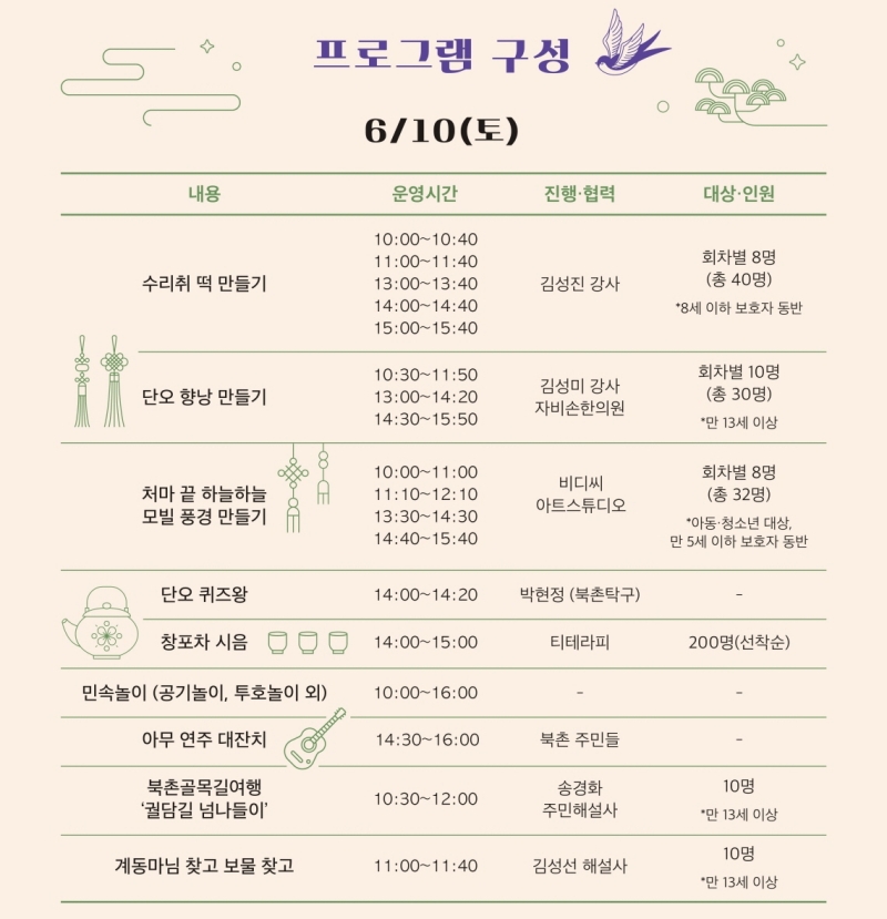 이번 행사는 북촌 주민을 비롯해 방문객, 다양한 문화주체가 어우러져 세시풍속을 재해석, 건강하고 풍요로운 여름을 기원하는 프로그램으로 진행된다. 먼저 6.10(토)에는 북촌 주민과 함께 대표적인 단오 음식 '수리취떡'을 만들어 먹고, 단오날 임금이 재상에게 하사한 부채 '단오선'도 만들어 본다.