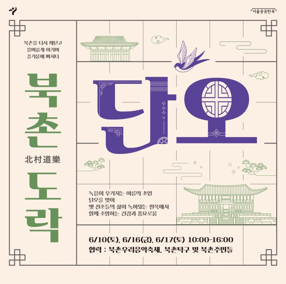 서울시는 6.10(토)과 6.16(금)~6.17(토) 북촌문화센터 및 북촌한옥청에서 '6월의 북촌도락- 네트워크 단오(端午)' 행사를 진행한다고 밝혔다. ○ 예로부터 설․추석과 함께 3대 명절 중 하나로 손꼽힌 '단오'는 몸을 씻어 제액(災厄)을 막고 좋은 음식과 민속놀이로 몸을 단련하며 풍년과 집안의 평안, 공동체 의식을 다지는 날이었다.
