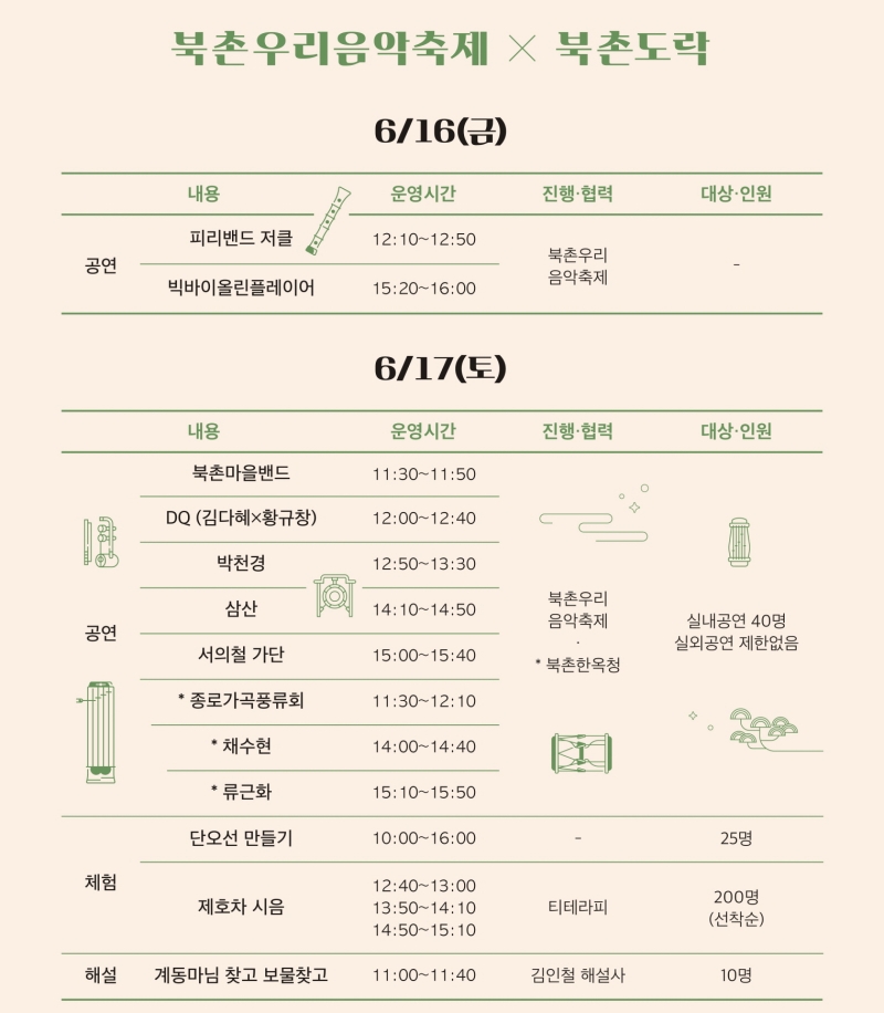 6.16(금)~6.17(토)에는 올해 11회째를 맞이한 '북촌우리음악축제'와 연계하여 북촌문화센터, 북촌한옥청을 주 무대로 여름의 풍요와 무탈을 기원하는 공연이 열린다. 최근 주목받는 국악인들이 대거 출연할 예정이며, 북촌주민으로 구성된 '북촌마을밴드'도 함께 무대에 설 예정이다.