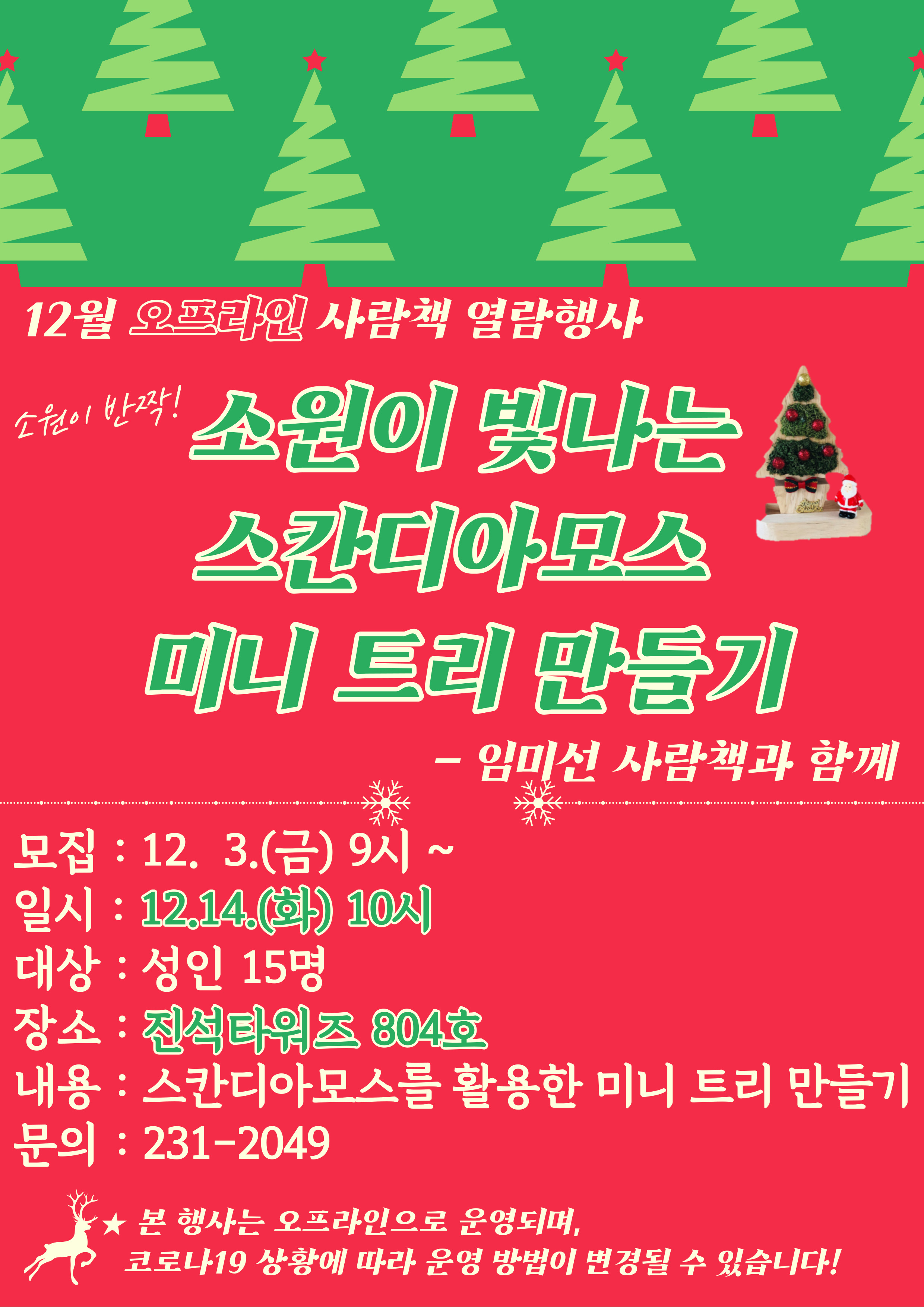 이번 사람책 열람행사에서는 목공 전문가인 임미선 사람책과 함께 곧 다가올 크리스마스의 설렘을 느끼며 공기 정화 기능이 있는 천연 이끼인 스칸디아모스를 활용한 미니 트리를 만들고 소원을 비는 시간을 가질 예정이다.