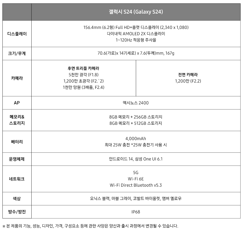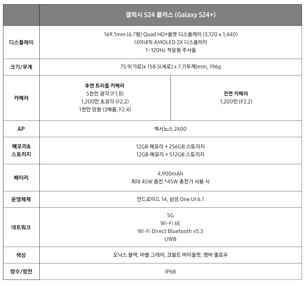 갤럭시 S24+와 갤럭시 S24는 오닉스 블랙, 마블 그레이, 코발트 바이올렛, 앰버 옐로우 4가지 색상으로 출시된다. 갤럭시 S24+는 256GB 모델이 135만 3천원, 512GB 모델이 149만 6천원이다. 갤럭시 S24는 256GB 모델이 115만 5천원, 512GB 모델이 129만 8천원이다.