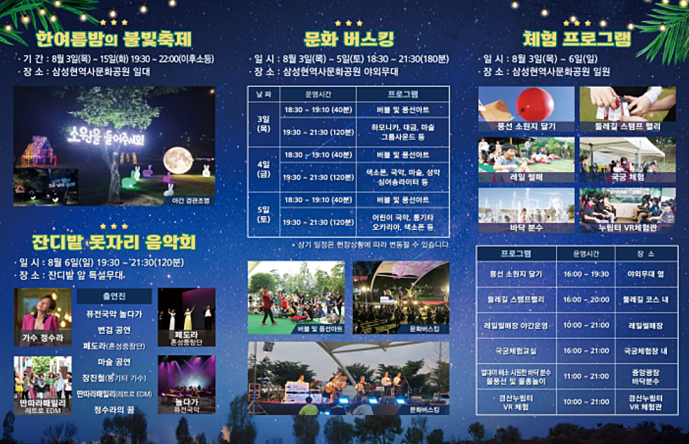 돗자리 음악회와 문화 버스킹 공연이 3일부터 6일까지 펼쳐지고 삼성현역사문화공원의 야경을 책임질 한여름밤 불빛축제가 15일까지 운영될 예정이다.