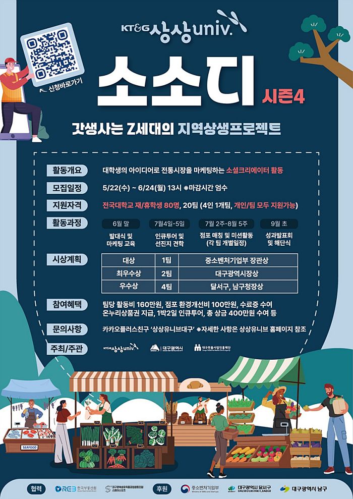 대구광역시는 KT&G 상상유니브* 대구운영사무국, 대구전통시장진흥재단과 함께 젊은 고객층 시각의 다양한 마케팅 활동을 통해 지역 소상공인 지원 및 전통시장 활성화 프로젝트인 ‘상상유니브 소소디** 시즌4’ 대학생 참가자를 5월 22일(수)부터 6월 24일(월)까지 모집한다.