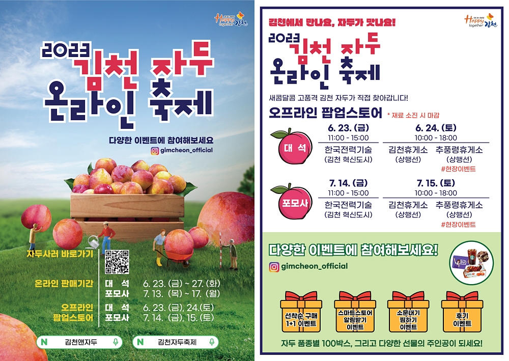 축제 기간 동안 김천 자두를 구매하고자 하는 소비자들은 네이버 스마트 스토어 ‘김천앤자두’에서 구매할 수 있으며, 축제홈페이지(www.gcjadu.com)에서는 다양한 이벤트가 준비되어있다.