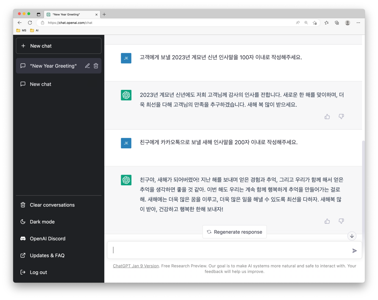 챗GPT는 대화형 인공지능이기에 답변 또한 앞서 나눈 대화에 맞게 생성한다. 지금까지 챗GPT를 사용해 한국어 새해 인사말과 영어 새해 인사말을 작성해봤다. 이렇듯 챗GPT는 다양하게 활용이 가능하다. 여러분도 챗GPT의 무궁무진한 가능성을 시험해보기 바란다.