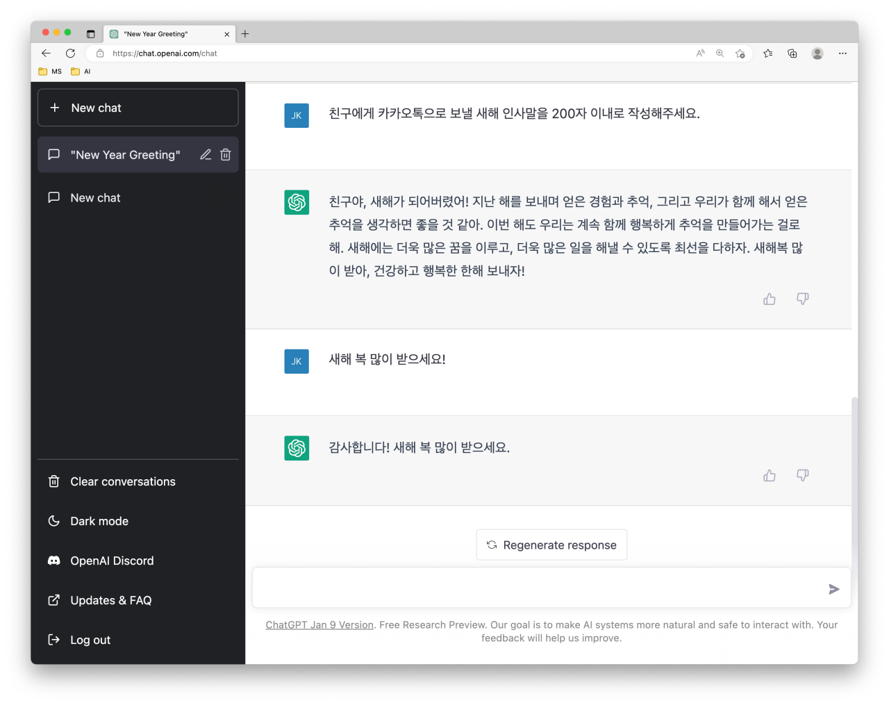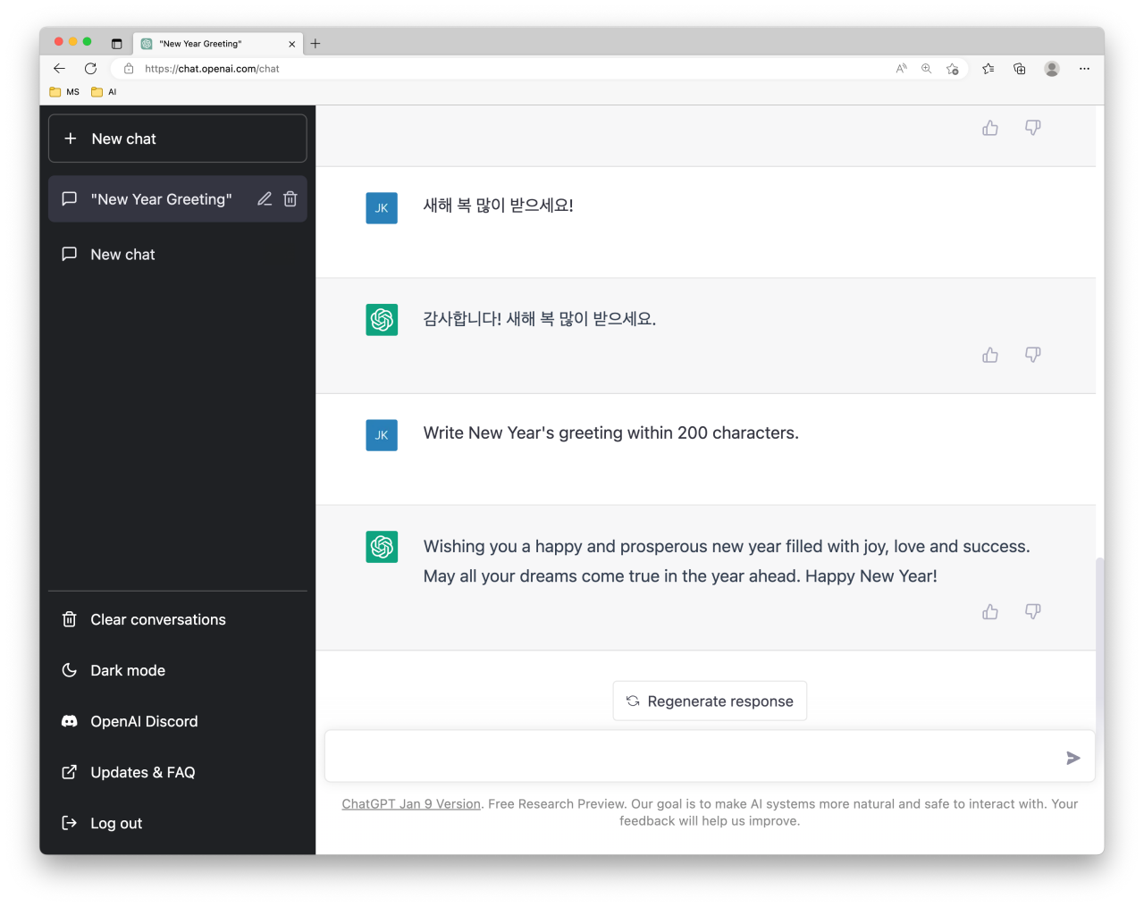 재미삼아 챗GPT에게 '새해 복 많이 받으세요!'라고 새해 인사를 건넸다. 마치 진짜 사람처럼 친절하게 '감사합니다! 새해 복 많이 받으세요'라고 답변을 해준다.
