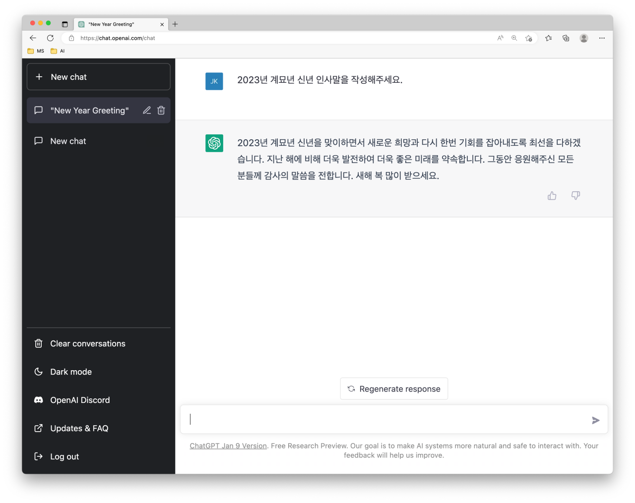 대화형 인공지능(AI) 챗GPT(ChatGPT)는 한국어로 질문을 하면 한국어로 답변을, 영어로 질문하면 영어로 답변을 한다. 이번에는 영어로 새해 인사말을 요청했다.