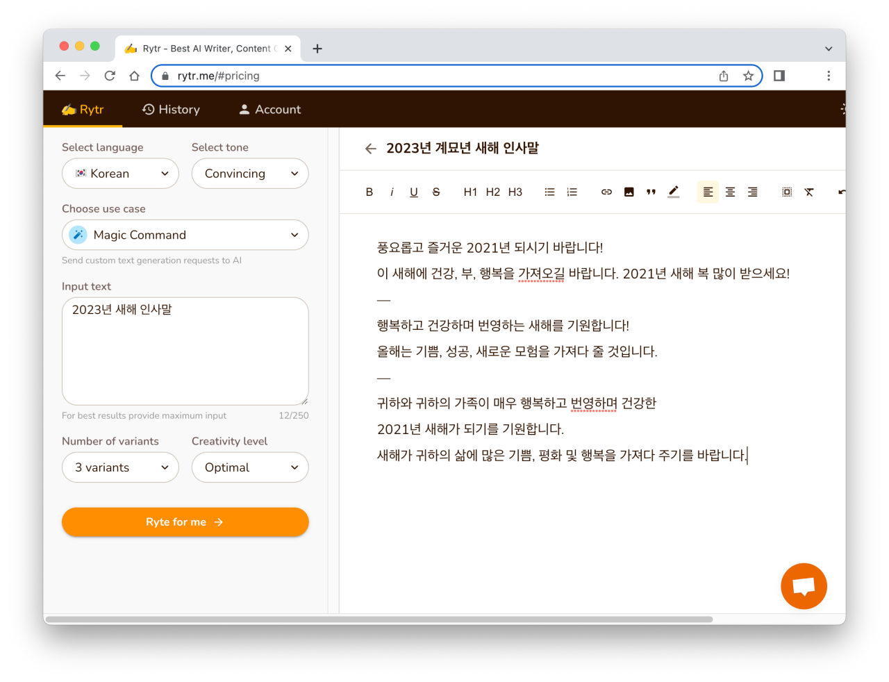 키워드를 입력하면 문장을 생성해주는 다양한 인공지능 컨텐츠 플랫폼이 속속 선보이고 있다. 한국어 입력이 가능한 서비스만 살펴보면 해외는 Rytr, 국내는 뤼튼이 유명하다. 이를 이용하면 간단히 새해 인사말 문구를 작성할 수 있다. 두 서비스 모두 무료 사용이 가능하지만 무료 플랜의 경우 글자수 제한이 있다.