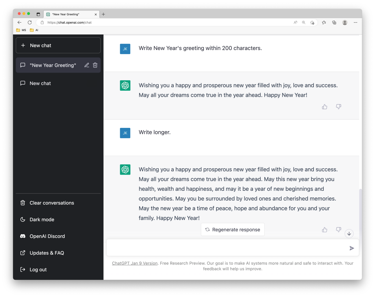 챗GPT는 머신 러닝을 통한 훈련으로 텍스트를 생성하는 모델이기에 데이터가 많을 수록 더욱 정확하고 자연스러운 텍스트를 생성한다. 그렇기에 데이터가 적은 한국어보다 영어로 질문을 하는 것이 보다 자연스러운 답변을 얻을 수 있다. 이번에는 좀 더 긴 새해 인사말을 요청했다.