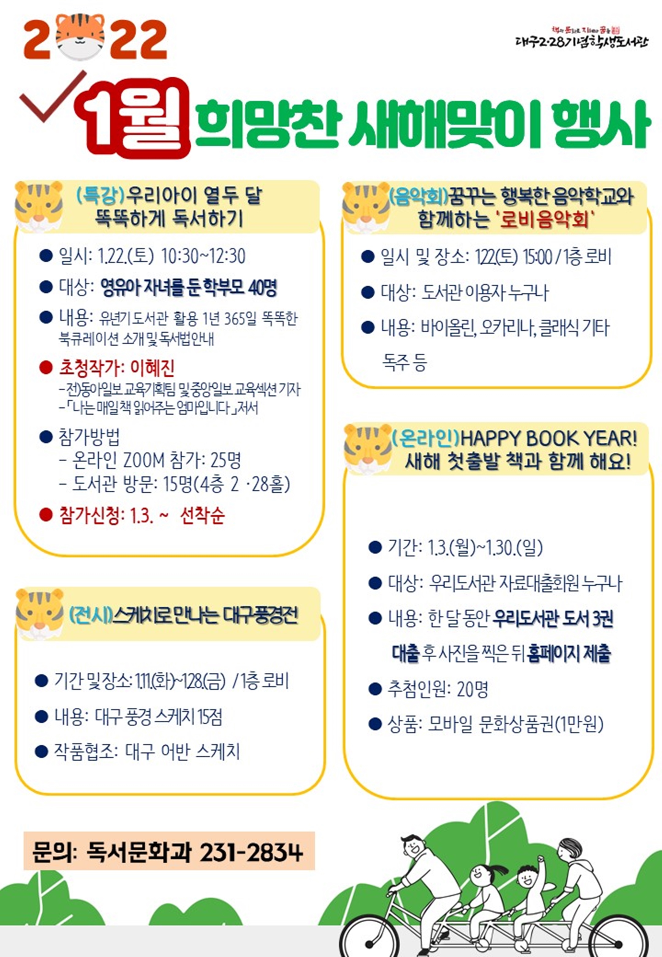 대구2·28기념학생도서관은 2022년 새해를 맞이하여 책으로 도서관에서 희망찬 기운을 받아 갈 수 있도록 ‘해피 북이어’, ‘우리 아이 열두 달 똑똑하게 독서하기 특강’ 등 다양한 행사를 마련하고 2022년 1월 3일(월)부터 도서관 홈페이지(http://library.daegu.go.kr/228)를 통해 참가자를 모집한다.