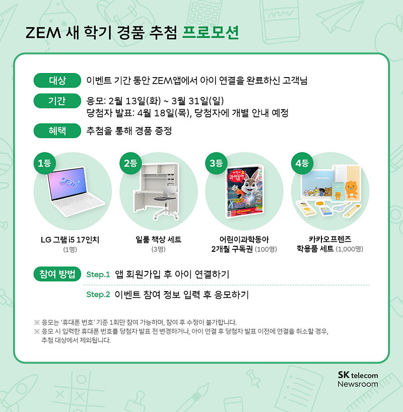 SKT는 새 학기를 맞아, 2월 13일부터 3월 31일까지 다양한 프로모션을 모은 ‘아이♥(러브) ZEM 새 학기 페스티벌’을 진행한다. ‘ZEM 새 학기 경품 추첨 프로모션’은 이벤트 기간 내에 ZEM 앱으로 자녀와 신규 연결한 고객을 대상으로 1,104명을 추첨해 LG 그램 노트북, 일룸 책상 세트, 어린이과학동아 2개월 구독권, 카카오프렌즈 학용품 세트 등 다양한 경품을 증정한다. 해당 이벤트는 ZEM 앱 내 이벤트 배너에서 응모할 수 있다.