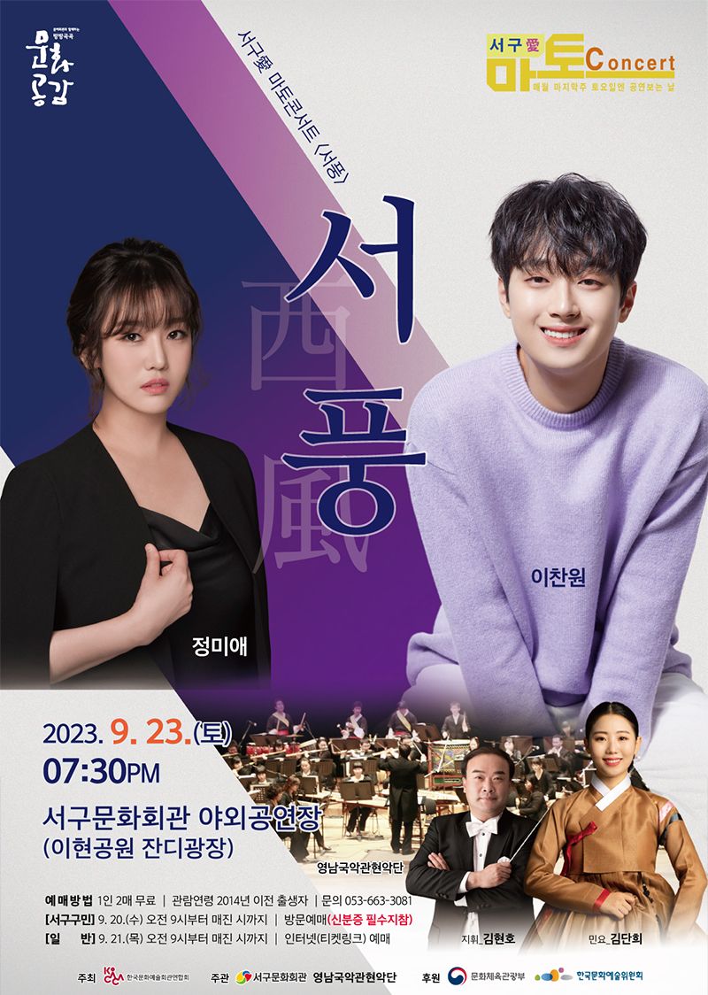 서구愛 마토콘서트‘서풍’공연은 서구문화회관에서 매년 이현공원 잔디광장에서 개최하고 있는 브랜드 공연으로 올해는 대구 출신의 국민 트로트 가수 이찬원과 정미애, 대구의 유일한 서도민요 소리꾼 김단희를 초청하여 영남국악관현악단(지휘 김현호)과의 국악 오케스트라 협연으로 라이브 무대를 마련하였다.