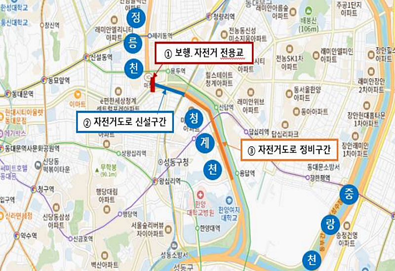 이 외에도 정릉천~청계천~신답철교에 이르는 485m의 자전거도로도 신설하고, 신답철교~중랑천 합류부의 노후 자전거도로 1,140m구간은 재포장해 명실상부 도심을 잇는 편리한 자전거 네트워크를 완성했다.