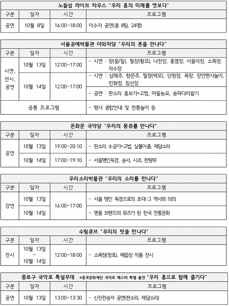 같은 기간에 진행하는 종로문화재단의 국악로 페스타 행사에서도 서울시무형문화재 관련 공연을 만날 수 있다. 10월 14일(토) 13시부터 13시 30분까지 ‘국악로 페스타’의 특별 행사로 판소리와 재담소리 종목의 청소년 신진 전승자의 공연이 펼쳐진다.