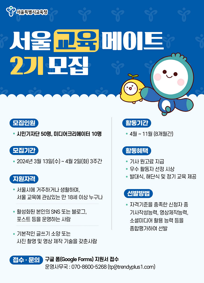 서울특별시교육청은 3월 13일(수)부터 4월 2일(화)까지 서울교육메이트(온라인 서포터즈) 2기를 모집한다. 선발 규모는 총 60명 안팎으로, 소셜미디어 기자단(50명), 미디어크리에이터(10명)으로 구성할 예정이다.