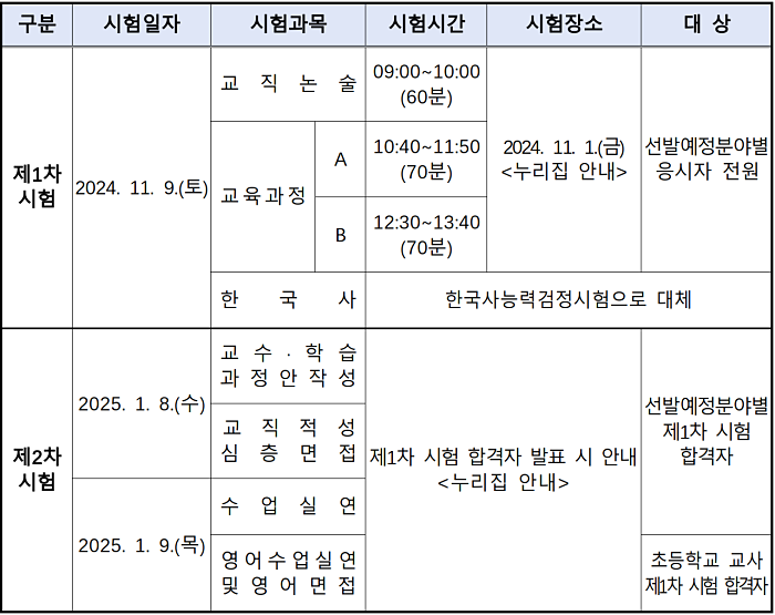 서울특별시교육청은 ‘2025학년도 공립(국·사립) 유치원·초등학교·특수학교(유치원·초등)교사 임용후보자 선정경쟁시험 시행계획’을 9월 11일(수) 서울특별시교육청 누리집(www.sen.go.kr)을 통해 공고한다.
