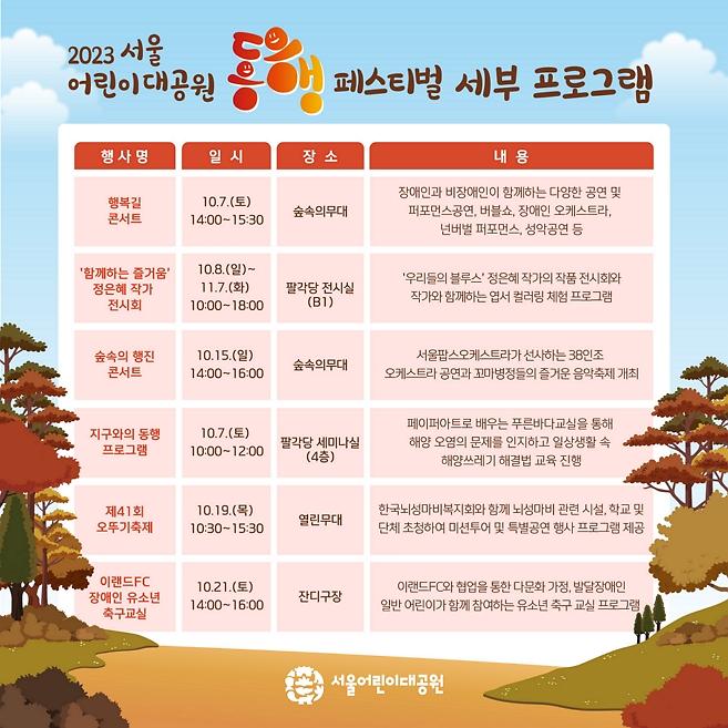 ‘2023 서울어린이대공원 동행 페스티벌’ 은 함께 길을 걷는 ‘동행(同行)’ 의 의미와 어린이 동(童), 행복 행(幸)의 중의적인 의미를 담아, 장애·비장애인들이 함께 참여하는 프로그램을 통해 어린이들의 장애인식 개선에 기여하자는 취지로 기획됐고 서울어린이대공원에서 10월 7일 부터 11월 7일까지 진행된다.