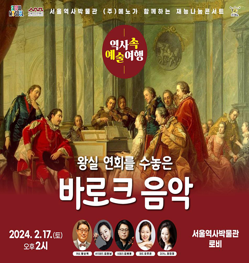 서울역사박물관은「역사 속 예술 여행」이라는 테마로 2024년 재능나눔콘서트를 개최하며 ‘왕실 연회를 수놓은 바로크 음악’을 주제로 2월 17일(토) 오후 2시 박물관 로비에서 첫 연주회를 선보인다.