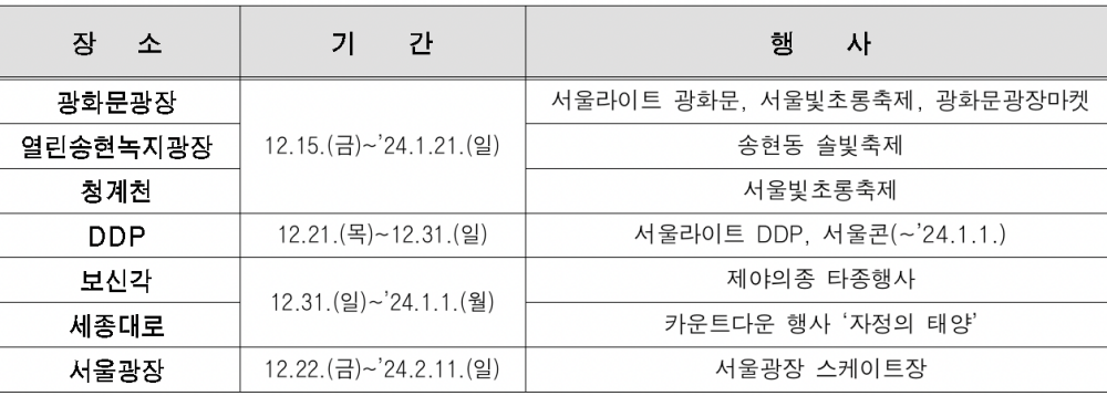 광화문광장 마켓은 12.15.(금)부터, DDP 크리스마스 마켓은 12.21.(목)부터 시민들을 맞이한다. 서울광장 스케이트장은 12.22.(금)~’24.2.11.(일)까지 즐거운 겨울 추억을 선사할 계획이다.