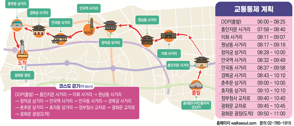 행사 구간은 DDP를 출발해 흥인지문~창덕궁삼거리~경복궁사거리~광화문광장까지 이어지는 6㎞ 코스다. 참가자들은 이날 오전 8시부터 전통과 현대의 미가 조화를 이루는 도심을 안전하게 걷게 된다.