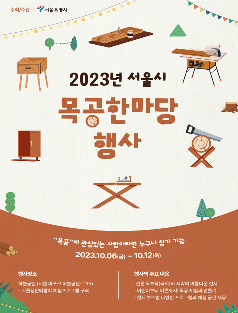 서울특별시는 월드컵공원 하늘공원에서 10월 6일부터 12일까지 7일간 다양한 목공체험이 가능한 ‘서울 목공한마당’ 행사를 선보인다. 이번 행사에서는 전통적인 서각, 목부작(국화) 등 전시와 목공제품을 만들어볼 수 있는 참여 프로그램들이 준비되어 있다.